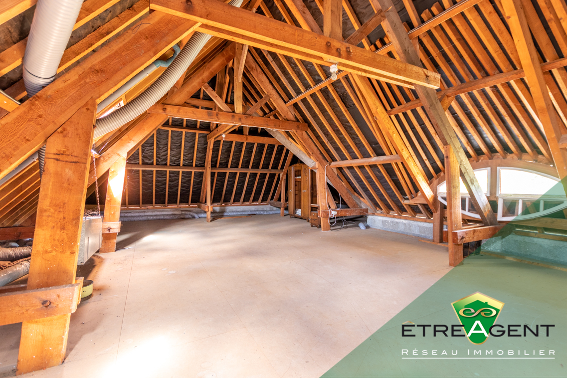 Près de l’entrée, un escalier mène aux combles scindés en deux espaces. Une bonne hauteur sous plafond permet de les aménager, alternativement seront utiles en tant que large espace de stockage.