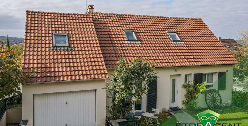 Nous vous proposons cette belle maison individuelle de 110m² avec garage, construite sur un sous sol de 78m² et édifiée sur un très beau terrain de 950m² de terrain clos et arboré. Cette maison est agrémentée d’une MAGNIFIQUE terrasse avec une vue sur la vallée de la seine.